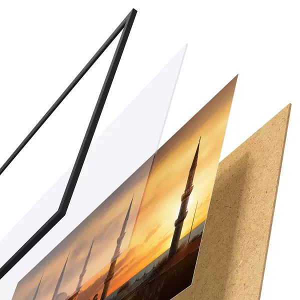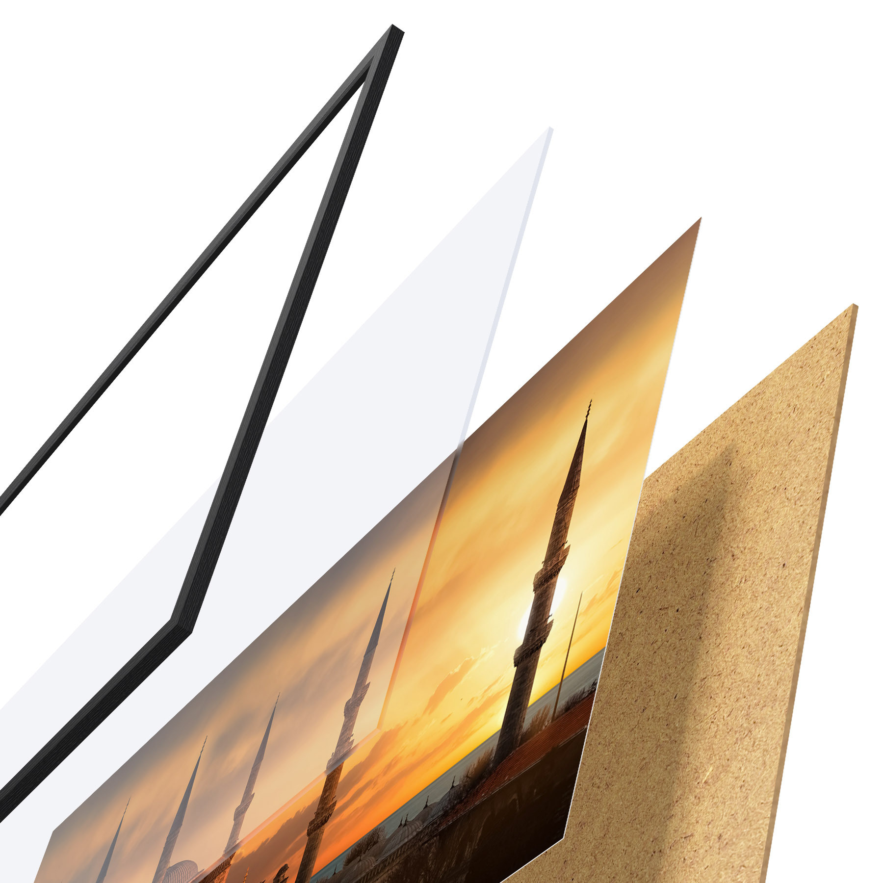 Le poster se compose d'un cadre, d'un plexiglas, d'une image imprimée et d'un support en aggloméré. Le poster peut être immédiatement accroché au mur grâce aux fixations au dos.