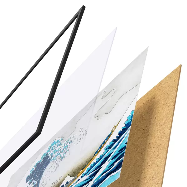 Le poster se compose d'un cadre, d'un plexiglas, d'une image imprimée et d'un support en aggloméré. Le poster peut être immédiatement accroché au mur grâce aux fixations au dos.