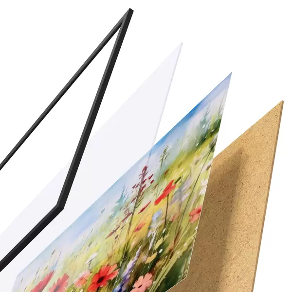 Le poster se compose d'un cadre, d'un plexiglas, d'une image imprimée et d'un support en aggloméré. Le poster peut être immédiatement accroché au mur grâce aux fixations au dos.