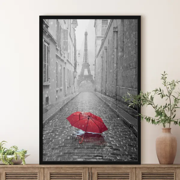 Affiche Parapluie rouge sur une rue pavée humide f33713