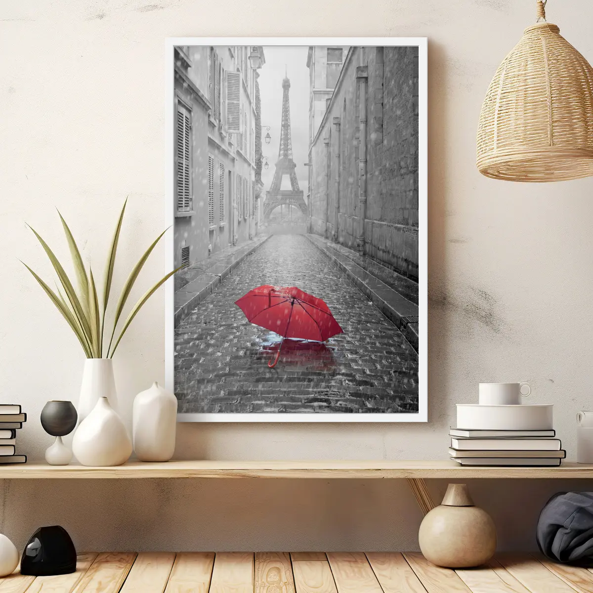 Affiche Parapluie rouge sur une rue pavée humide Non f33713