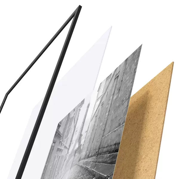 Le poster se compose d'un cadre, d'un plexiglas, d'une image imprimée et d'un support en aggloméré. Le poster peut être immédiatement accroché au mur grâce aux fixations au dos.