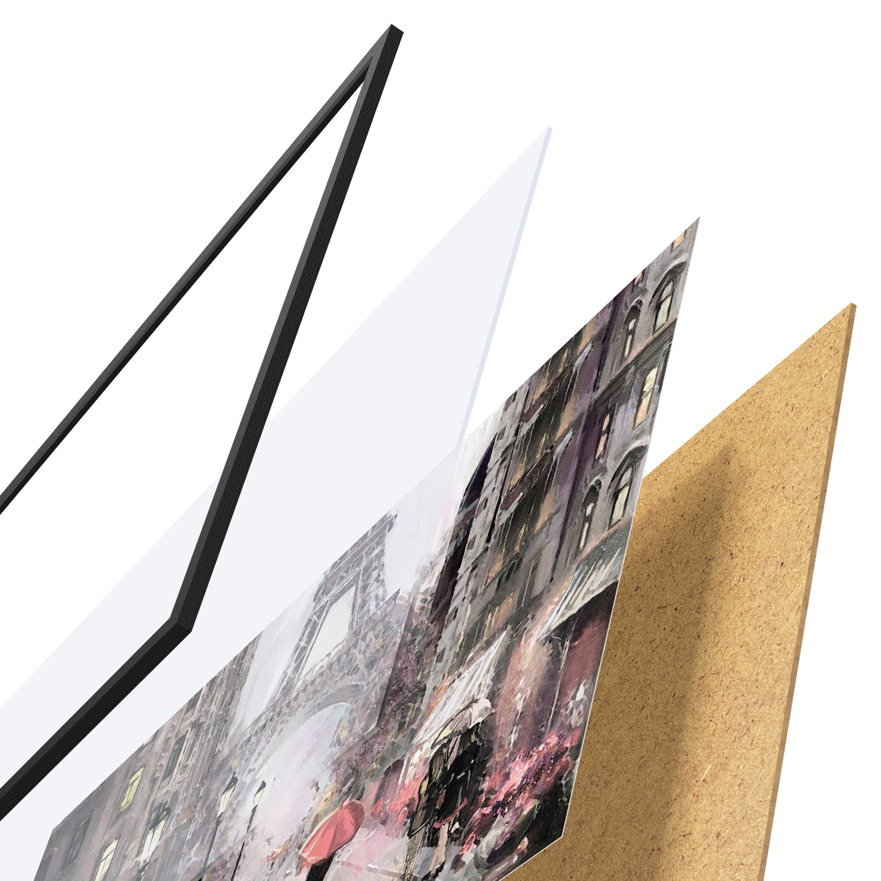 Le poster se compose d'un cadre, d'un plexiglas, d'une image imprimée et d'un support en aggloméré. Le poster peut être immédiatement accroché au mur grâce aux fixations au dos.