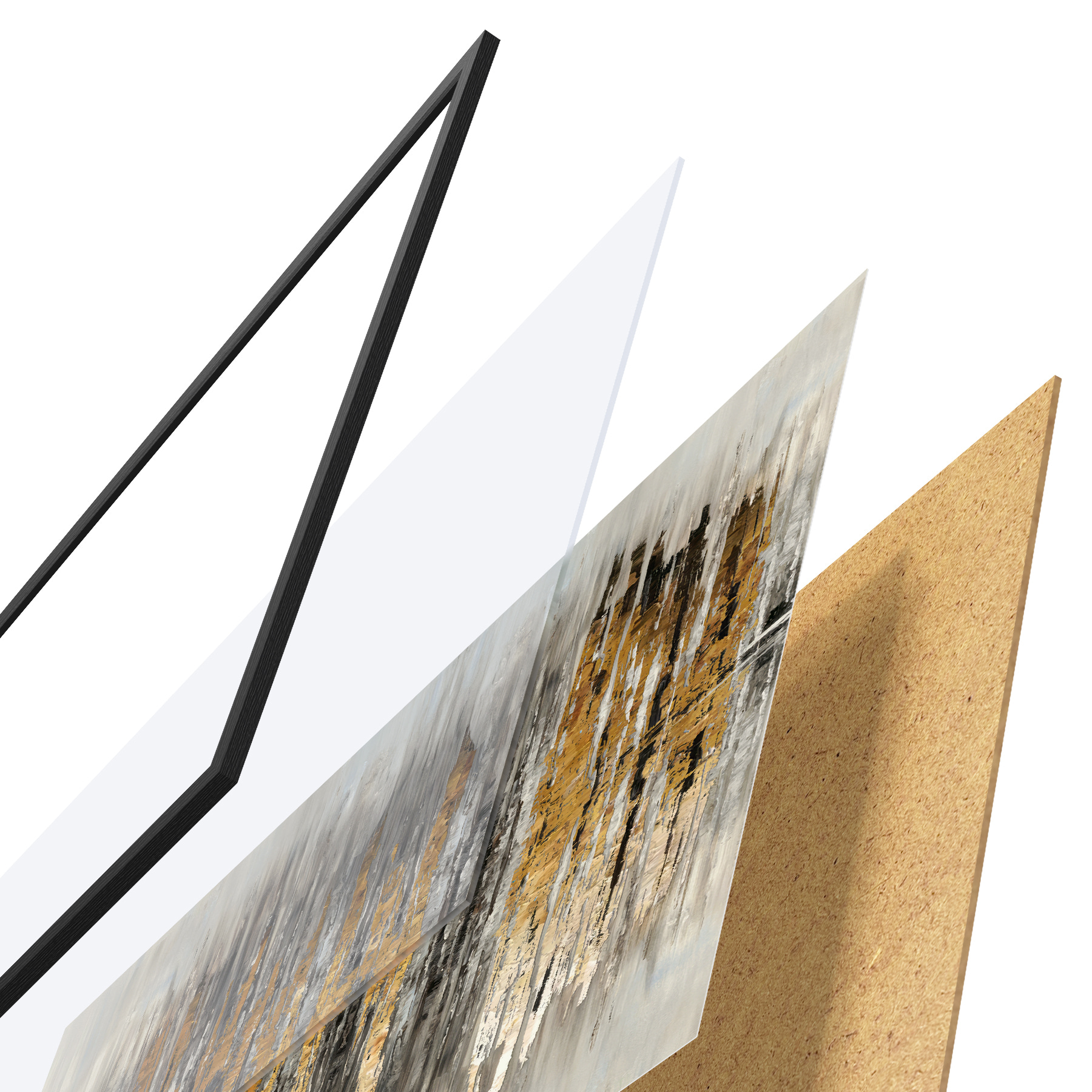 Le poster se compose d'un cadre, d'un plexiglas, d'une image imprimée et d'un support en aggloméré. Le poster peut être immédiatement accroché au mur grâce aux fixations au dos.