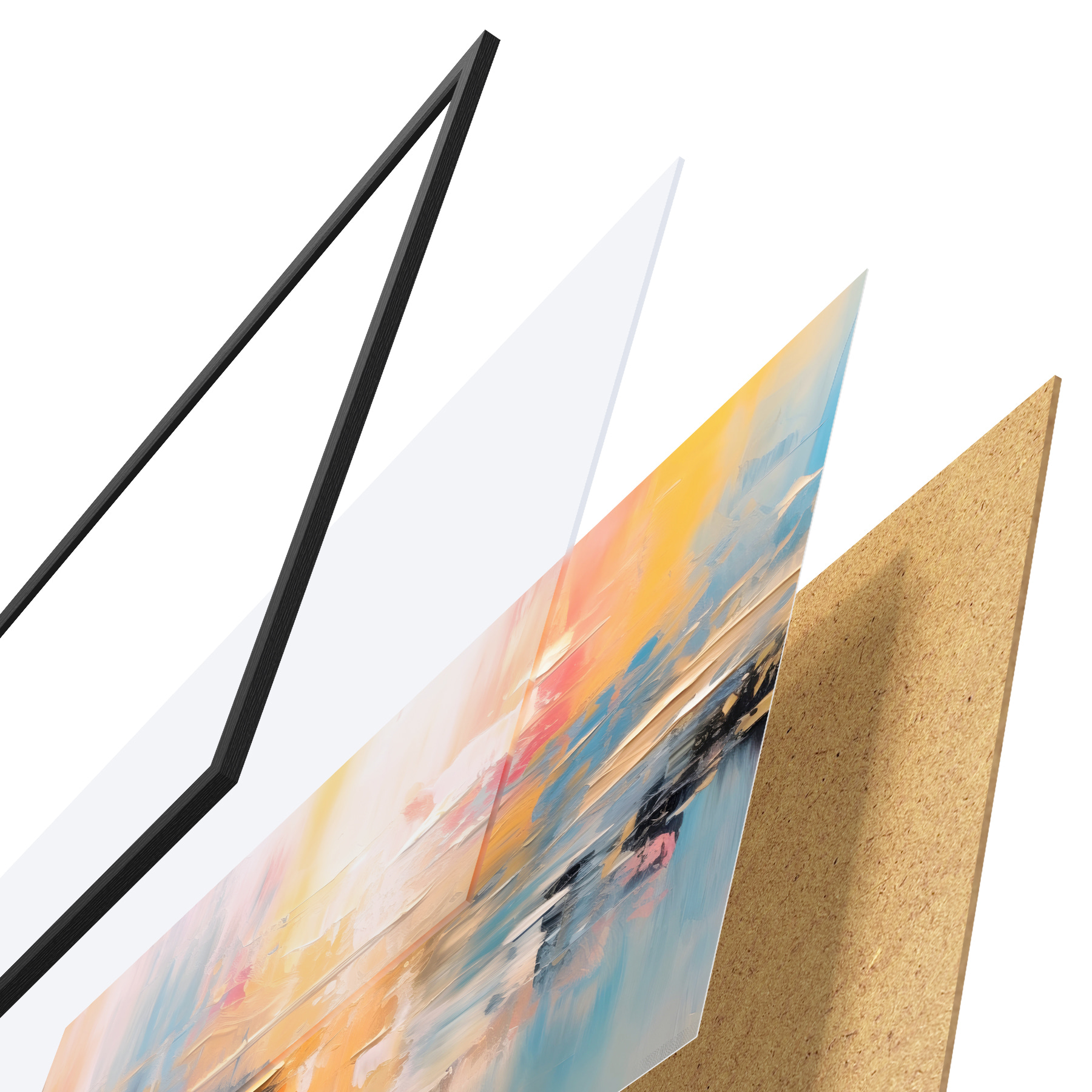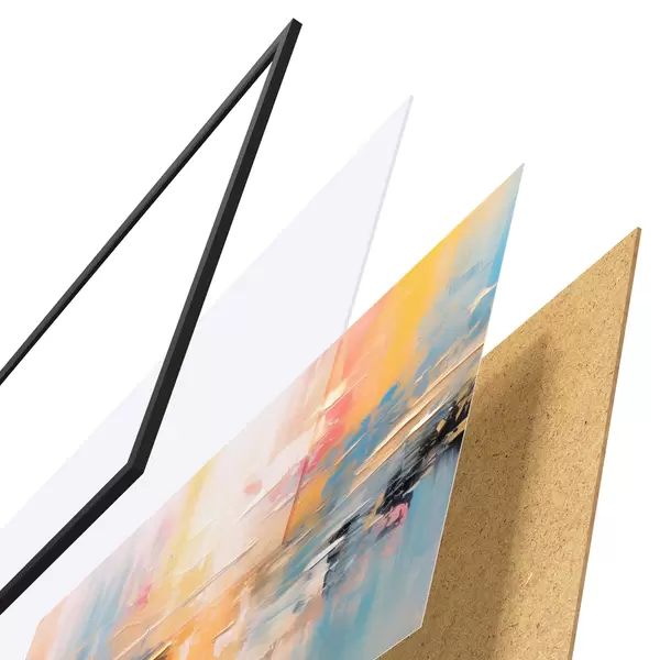 Le poster se compose d'un cadre, d'un plexiglas, d'une image imprimée et d'un support en aggloméré. Le poster peut être immédiatement accroché au mur grâce aux fixations au dos.