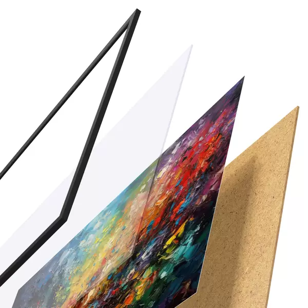 Le poster se compose d'un cadre, d'un plexiglas, d'une image imprimée et d'un support en aggloméré. Le poster peut être immédiatement accroché au mur grâce aux fixations au dos.