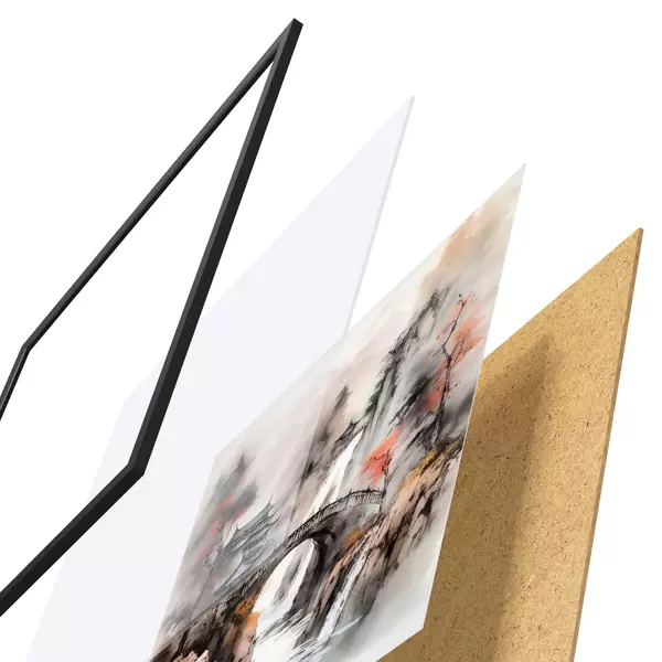 Le poster se compose d'un cadre, d'un plexiglas, d'une image imprimée et d'un support en aggloméré. Le poster peut être immédiatement accroché au mur grâce aux fixations au dos.