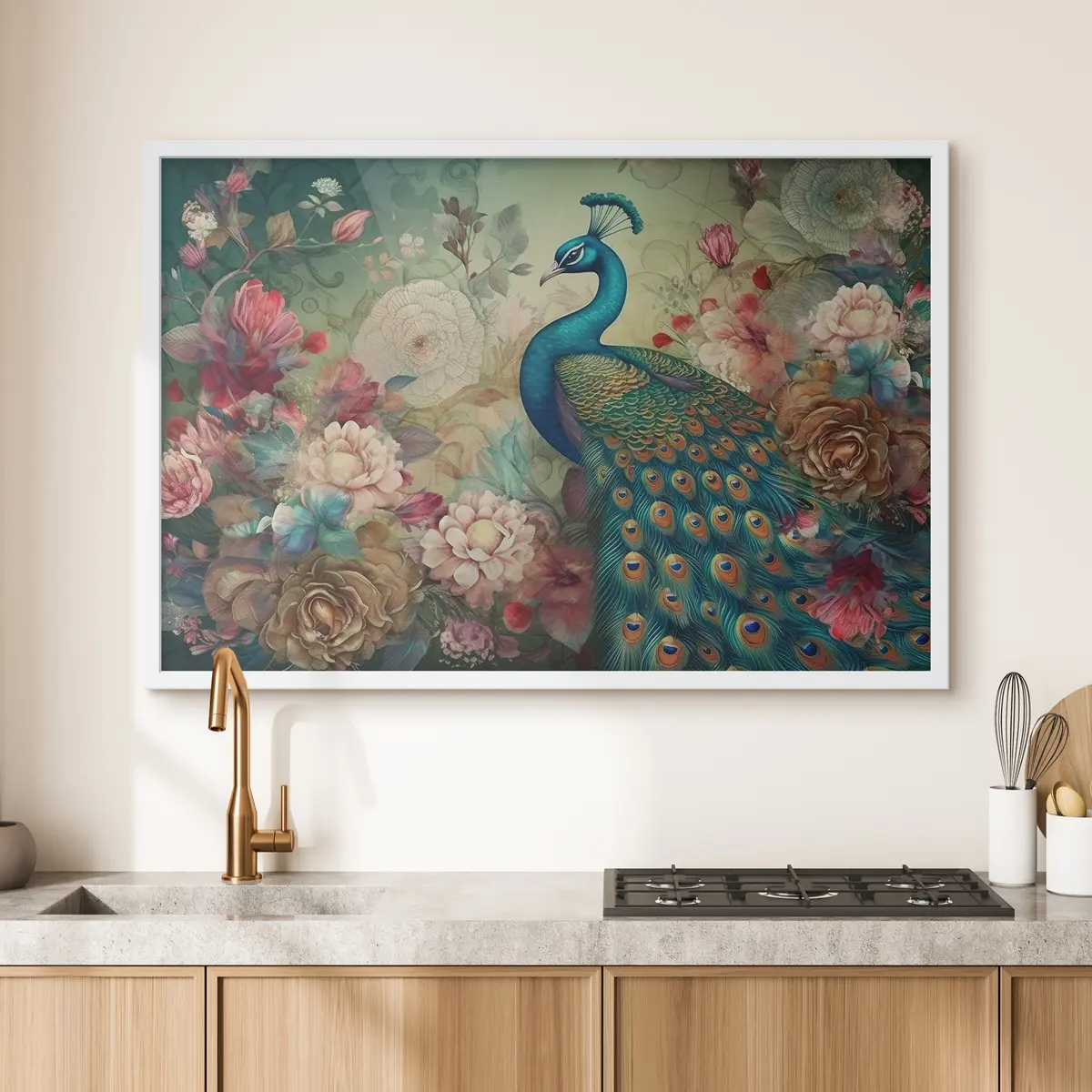 Affiche Paon brillant au milieu des fleurs épanouies f34869
