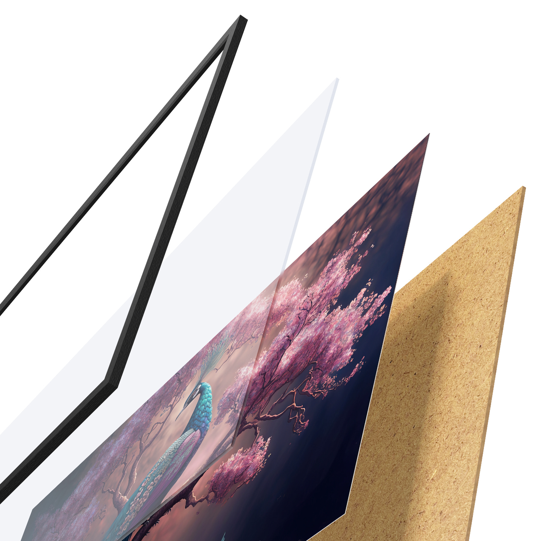 Le poster se compose d'un cadre, d'un plexiglas, d'une image imprimée et d'un support en aggloméré. Le poster peut être immédiatement accroché au mur grâce aux fixations au dos.