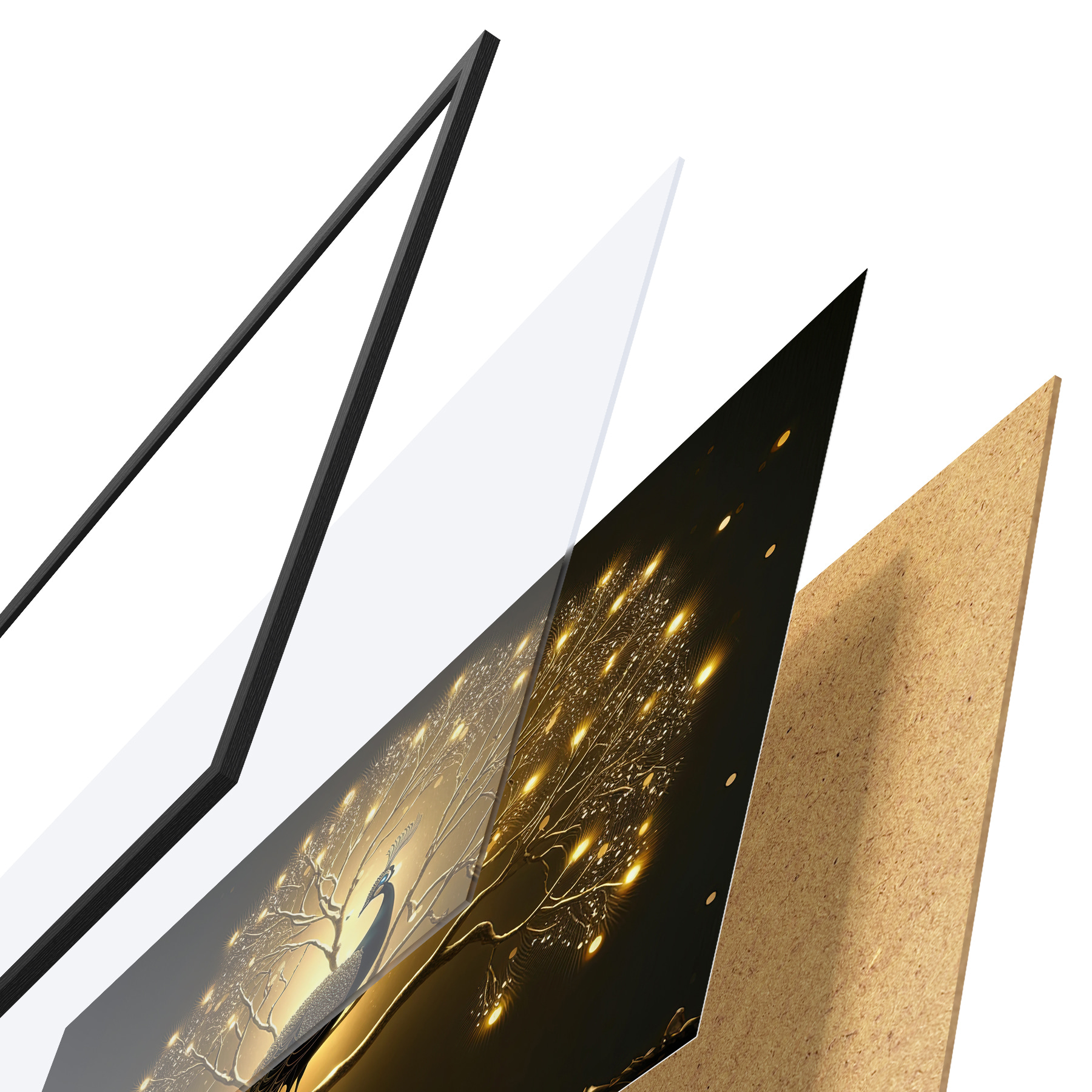 Le poster se compose d'un cadre, d'un plexiglas, d'une image imprimée et d'un support en aggloméré. Le poster peut être immédiatement accroché au mur grâce aux fixations au dos.