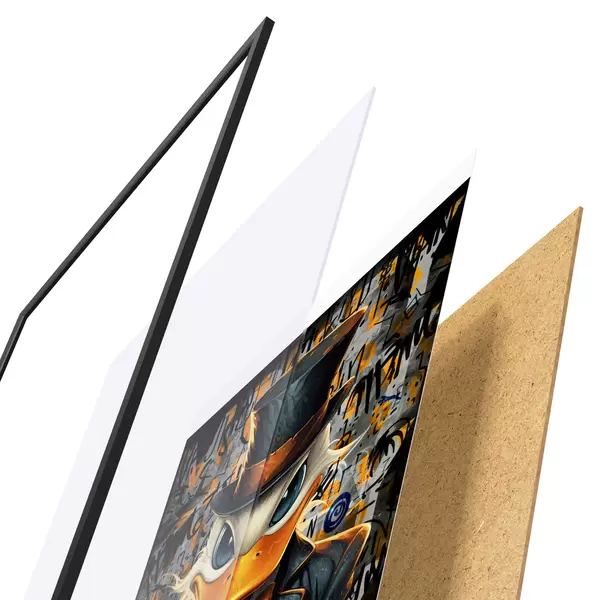 Le poster se compose d'un cadre, d'un plexiglas, d'une image imprimée et d'un support en aggloméré. Le poster peut être immédiatement accroché au mur grâce aux fixations au dos.