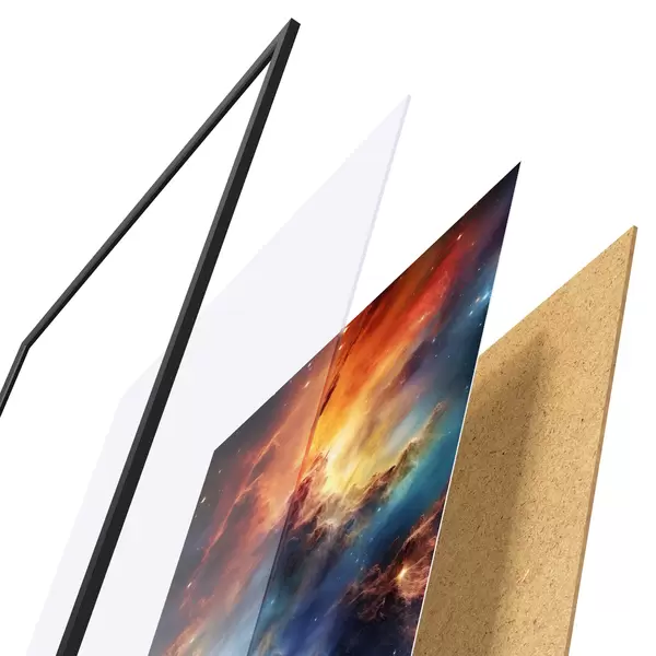 Le poster se compose d'un cadre, d'un plexiglas, d'une image imprimée et d'un support en aggloméré. Le poster peut être immédiatement accroché au mur grâce aux fixations au dos.