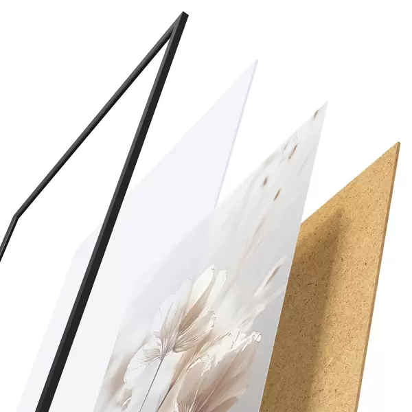 Le poster se compose d'un cadre, d'un plexiglas, d'une image imprimée et d'un support en aggloméré. Le poster peut être immédiatement accroché au mur grâce aux fixations au dos.
