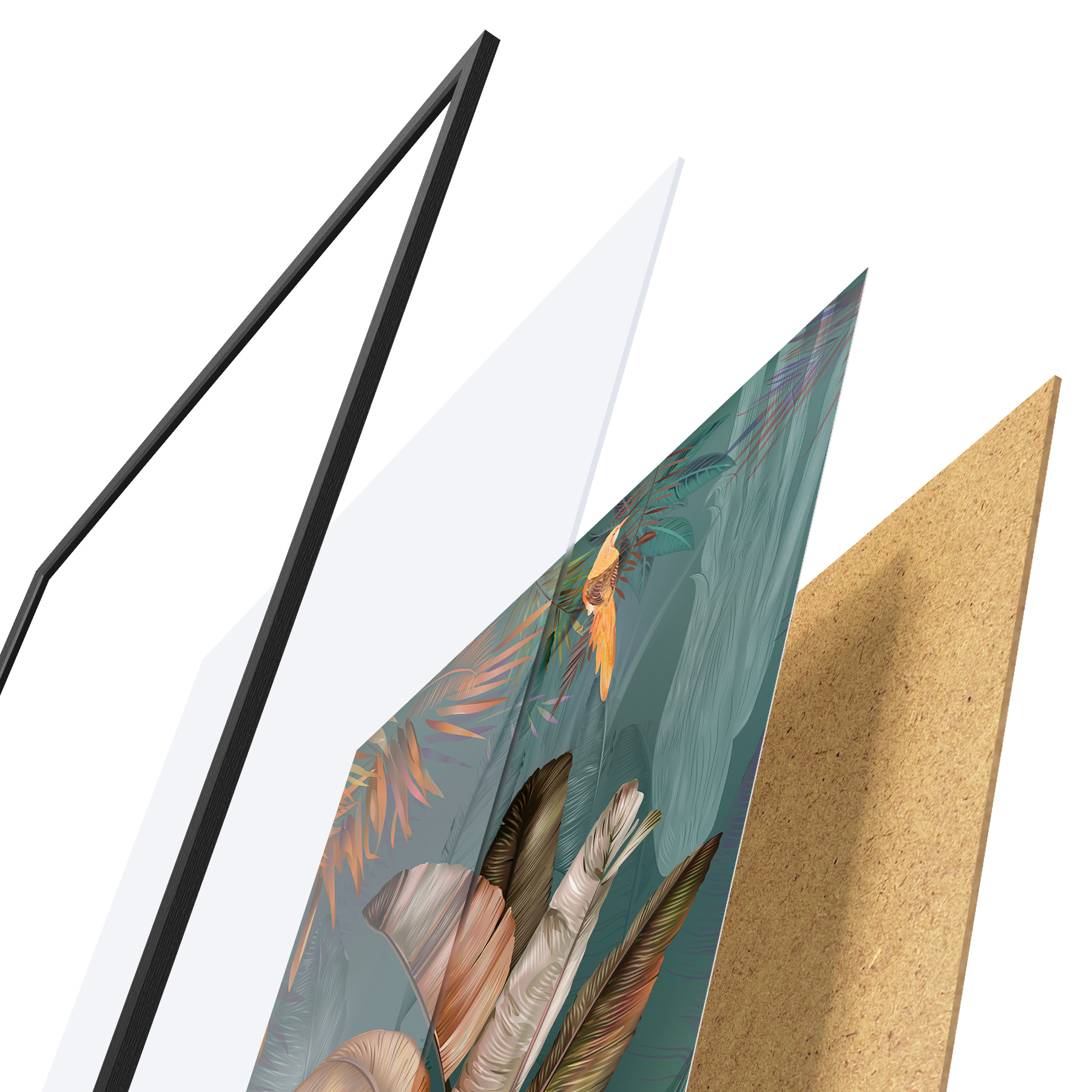 Le poster se compose d'un cadre, d'un plexiglas, d'une image imprimée et d'un support en aggloméré. Le poster peut être immédiatement accroché au mur grâce aux fixations au dos.