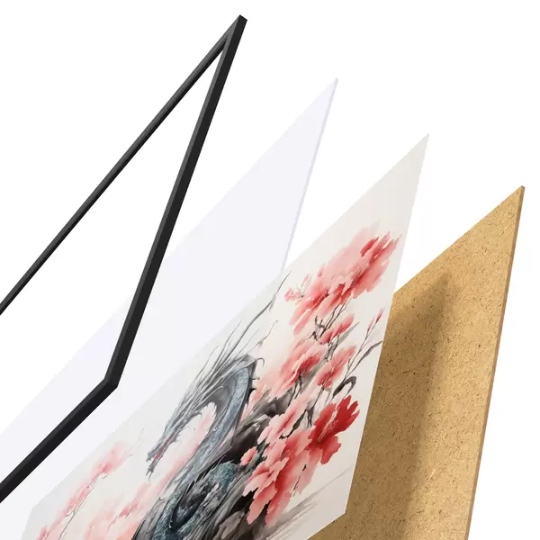 Le poster se compose d'un cadre, d'un plexiglas, d'une image imprimée et d'un support en aggloméré. Le poster peut être immédiatement accroché au mur grâce aux fixations au dos.