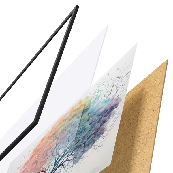 Le poster se compose d'un cadre, d'un plexiglas, d'une image imprimée et d'un support en aggloméré. Le poster peut être immédiatement accroché au mur grâce aux fixations au dos.