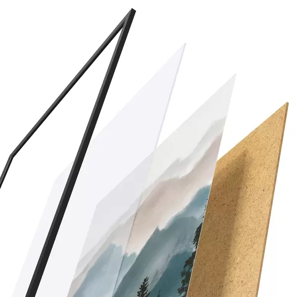 Le poster se compose d'un cadre, d'un plexiglas, d'une image imprimée et d'un support en aggloméré. Le poster peut être immédiatement accroché au mur grâce aux fixations au dos.