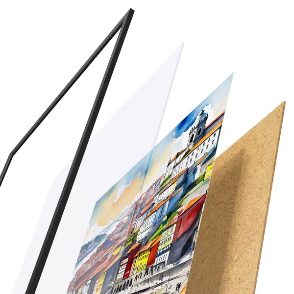 Le poster se compose d'un cadre, d'un plexiglas, d'une image imprimée et d'un support en aggloméré. Le poster peut être immédiatement accroché au mur grâce aux fixations au dos.