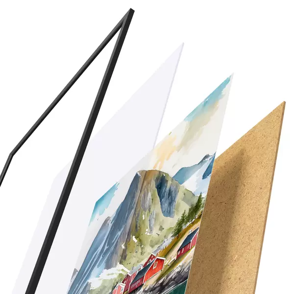 Le poster se compose d'un cadre, d'un plexiglas, d'une image imprimée et d'un support en aggloméré. Le poster peut être immédiatement accroché au mur grâce aux fixations au dos.