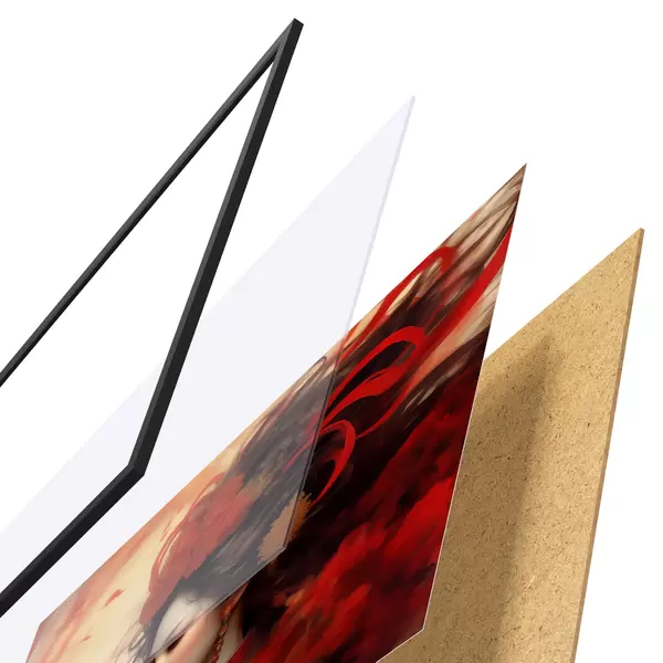 Le poster se compose d'un cadre, d'un plexiglas, d'une image imprimée et d'un support en aggloméré. Le poster peut être immédiatement accroché au mur grâce aux fixations au dos.