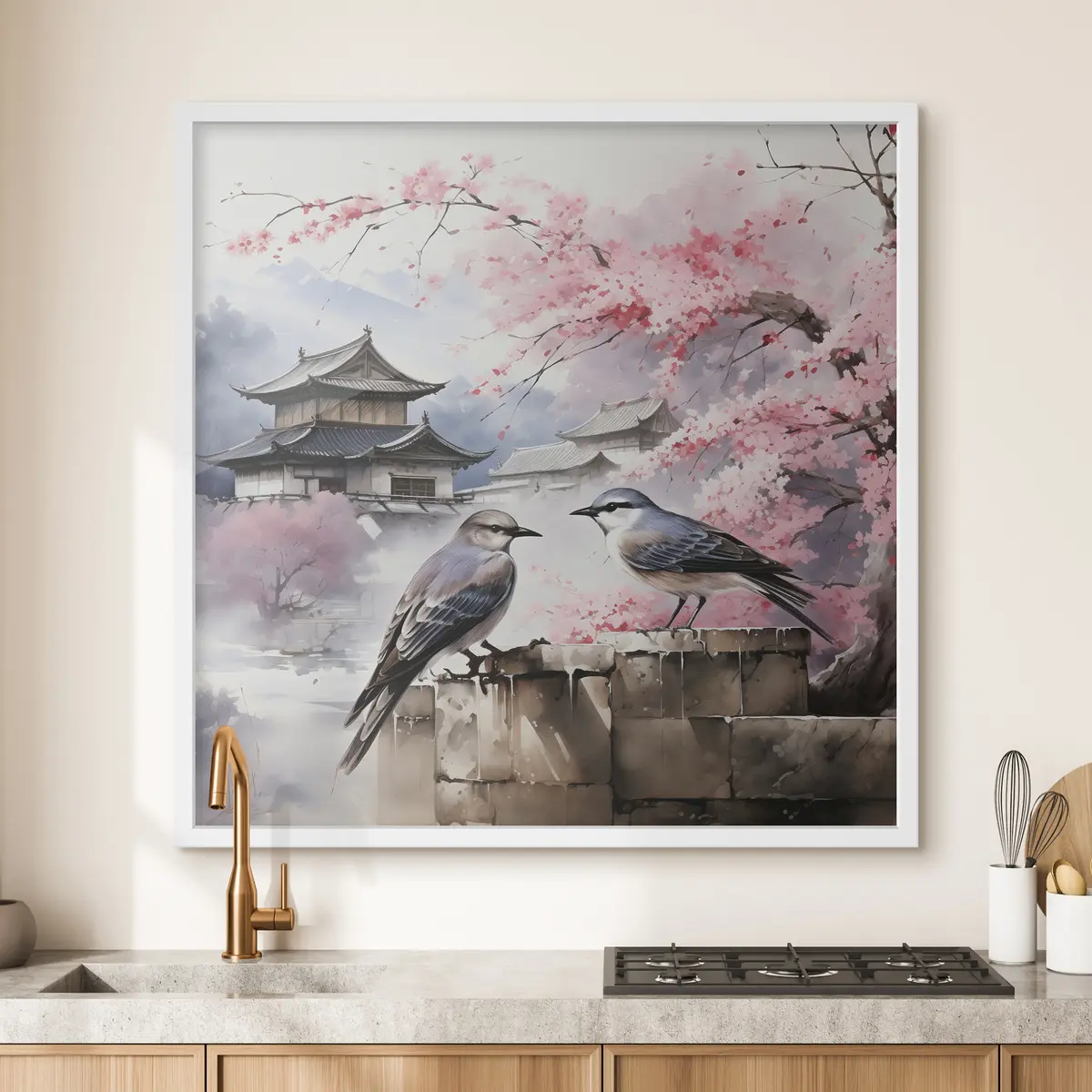 Affiche Deux oiseaux près des fleurs de cerisier Non f36815