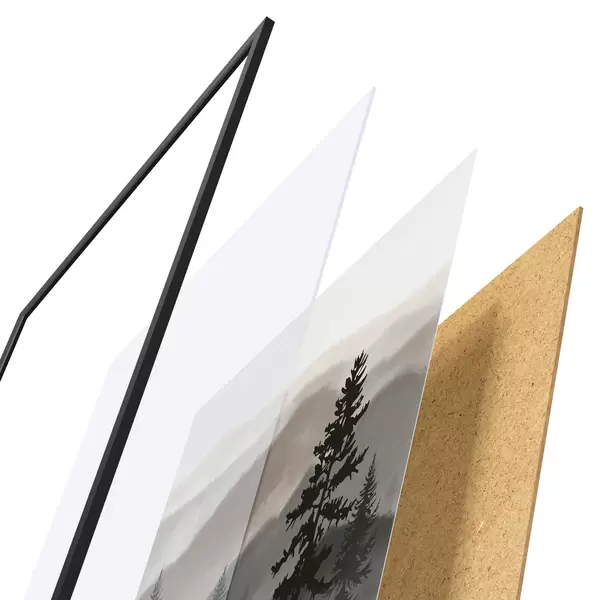 Le poster se compose d'un cadre, d'un plexiglas, d'une image imprimée et d'un support en aggloméré. Le poster peut être immédiatement accroché au mur grâce aux fixations au dos.
