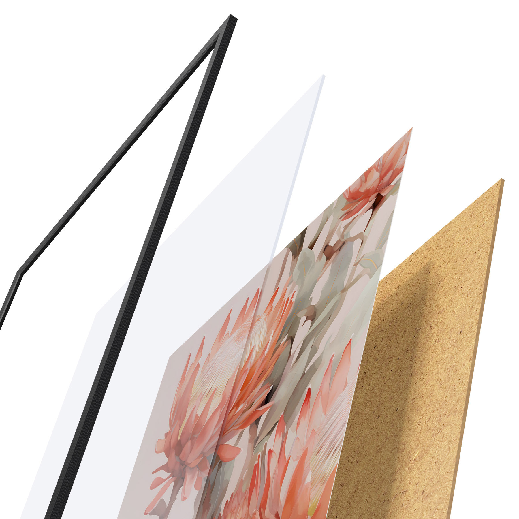 Le poster se compose d'un cadre, d'un plexiglas, d'une image imprimée et d'un support en aggloméré. Le poster peut être immédiatement accroché au mur grâce aux fixations au dos.