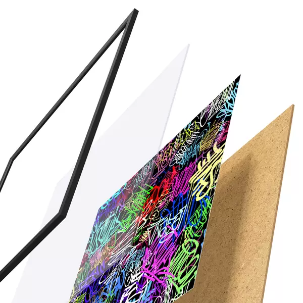 Le poster se compose d'un cadre, d'un plexiglas, d'une image imprimée et d'un support en aggloméré. Le poster peut être immédiatement accroché au mur grâce aux fixations au dos.