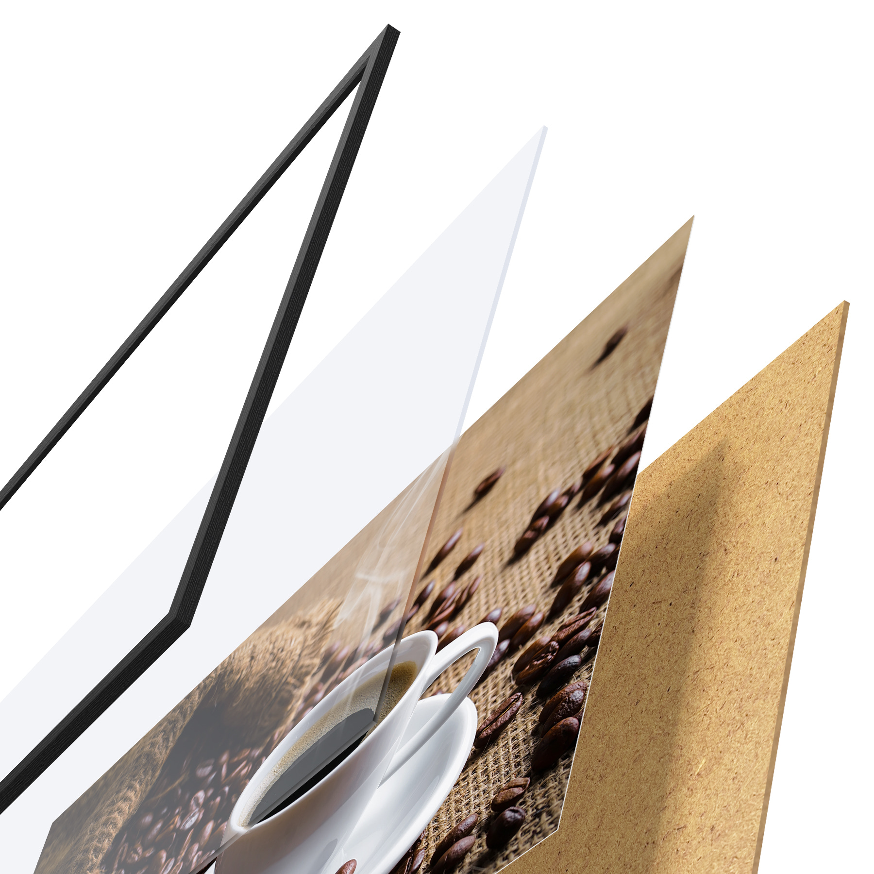 Le poster se compose d'un cadre, d'un plexiglas, d'une image imprimée et d'un support en aggloméré. Le poster peut être immédiatement accroché au mur grâce aux fixations au dos.