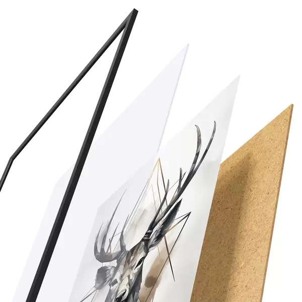 Le poster se compose d'un cadre, d'un plexiglas, d'une image imprimée et d'un support en aggloméré. Le poster peut être immédiatement accroché au mur grâce aux fixations au dos.