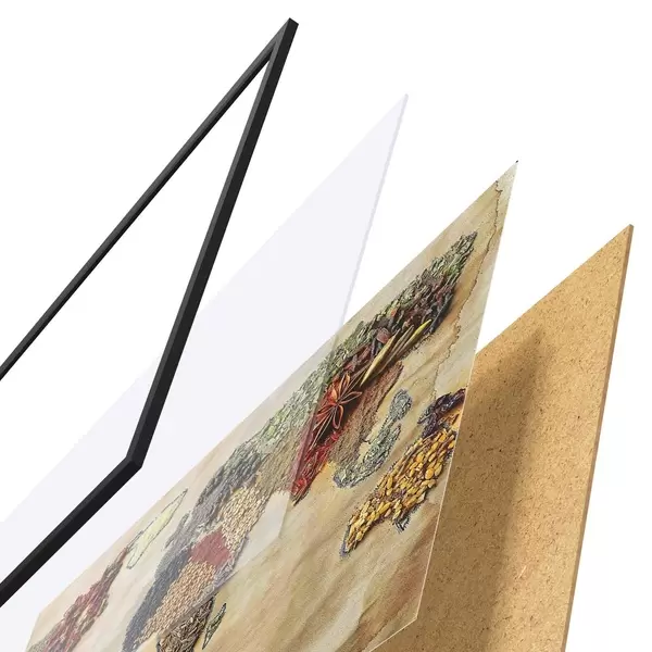 Le poster se compose d'un cadre, d'un plexiglas, d'une image imprimée et d'un support en aggloméré. Le poster peut être immédiatement accroché au mur grâce aux fixations au dos.