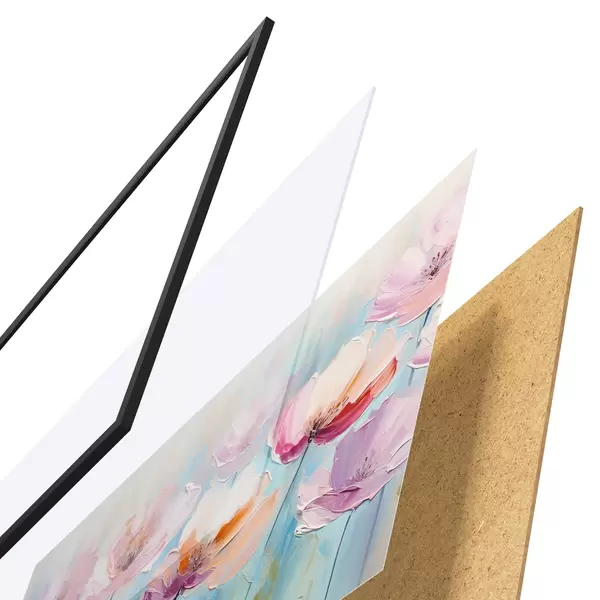 Le poster se compose d'un cadre, d'un plexiglas, d'une image imprimée et d'un support en aggloméré. Le poster peut être immédiatement accroché au mur grâce aux fixations au dos.