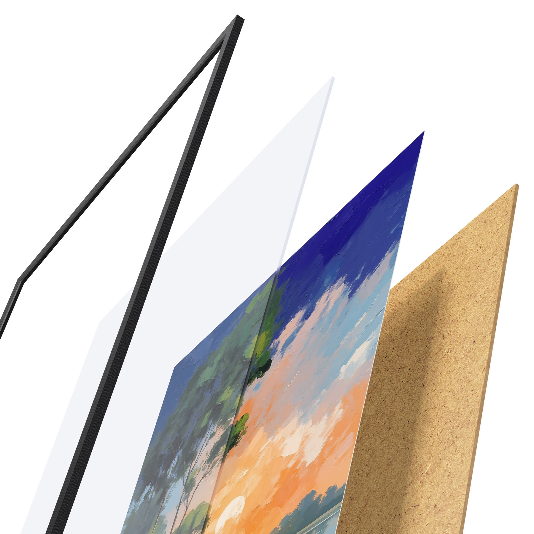 Le poster se compose d'un cadre, d'un plexiglas, d'une image imprimée et d'un support en aggloméré. Le poster peut être immédiatement accroché au mur grâce aux fixations au dos.
