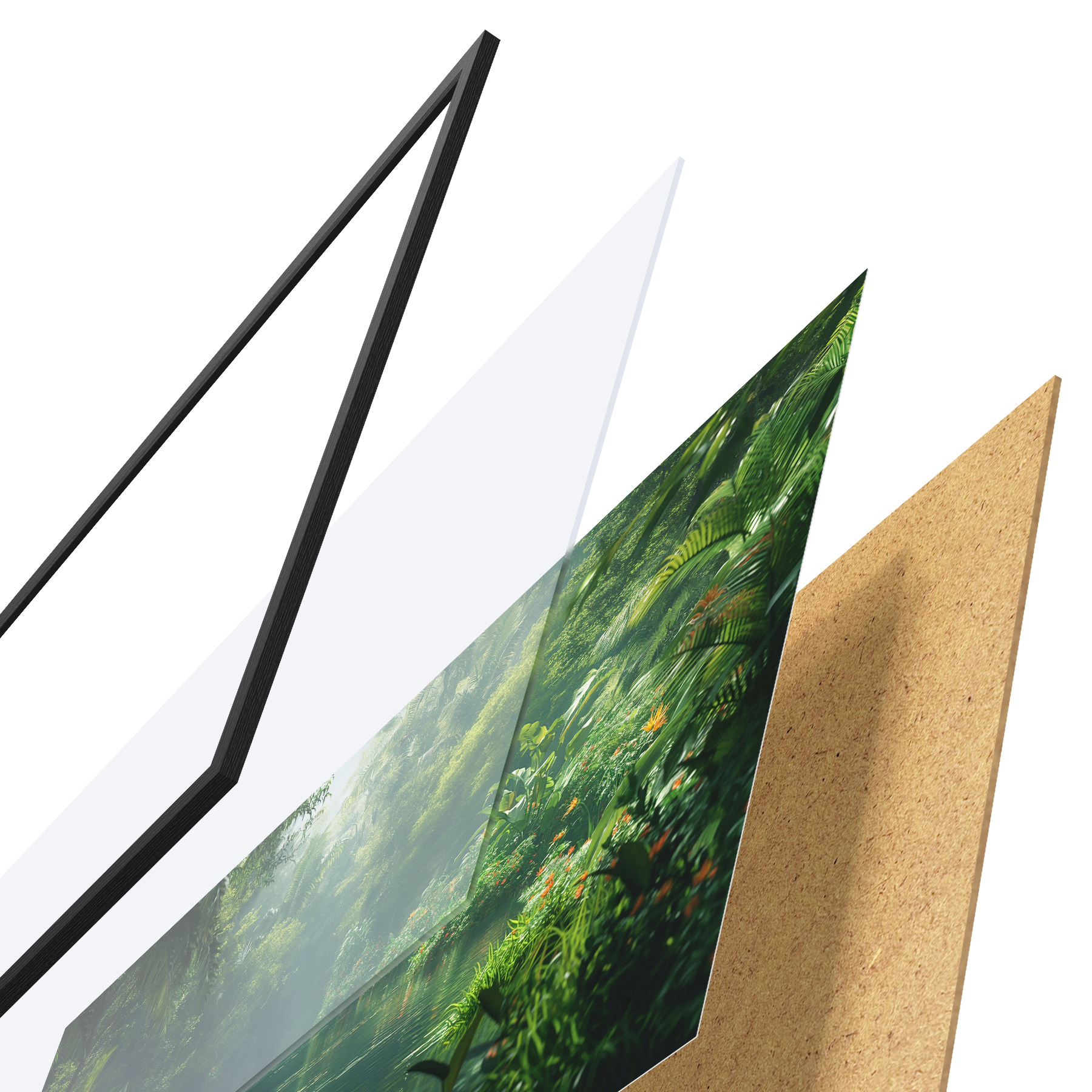 Le poster se compose d'un cadre, d'un plexiglas, d'une image imprimée et d'un support en aggloméré. Le poster peut être immédiatement accroché au mur grâce aux fixations au dos.