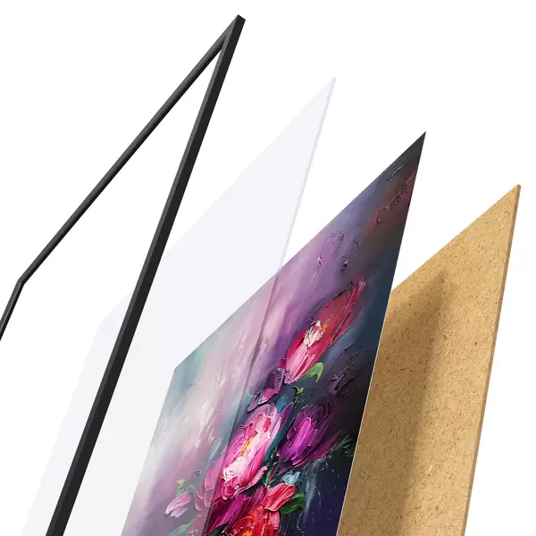 Le poster se compose d'un cadre, d'un plexiglas, d'une image imprimée et d'un support en aggloméré. Le poster peut être immédiatement accroché au mur grâce aux fixations au dos.
