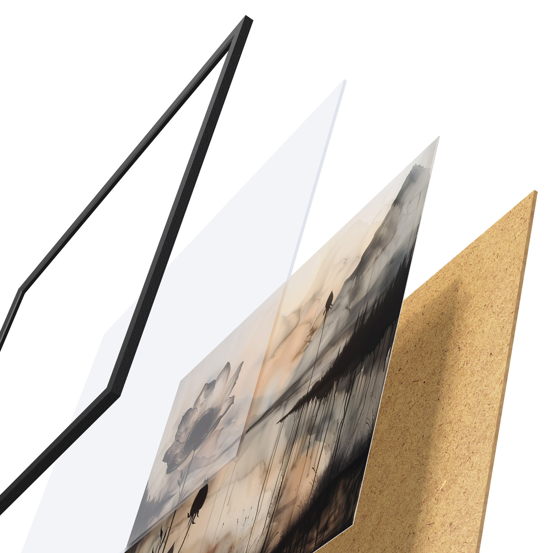 Le poster se compose d'un cadre, d'un plexiglas, d'une image imprimée et d'un support en aggloméré. Le poster peut être immédiatement accroché au mur grâce aux fixations au dos.