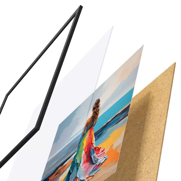 Le poster se compose d'un cadre, d'un plexiglas, d'une image imprimée et d'un support en aggloméré. Le poster peut être immédiatement accroché au mur grâce aux fixations au dos.