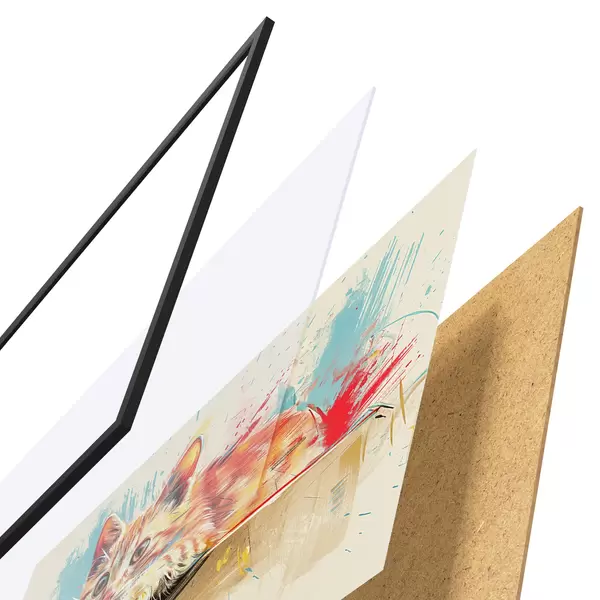 Le poster se compose d'un cadre, d'un plexiglas, d'une image imprimée et d'un support en aggloméré. Le poster peut être immédiatement accroché au mur grâce aux fixations au dos.