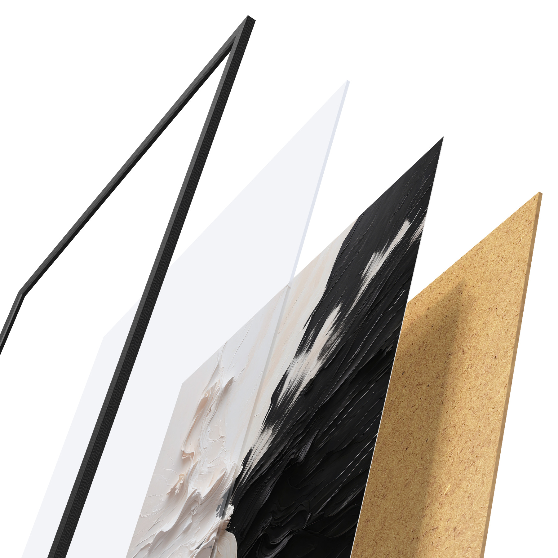 Le poster se compose d'un cadre, d'un plexiglas, d'une image imprimée et d'un support en aggloméré. Le poster peut être immédiatement accroché au mur grâce aux fixations au dos.