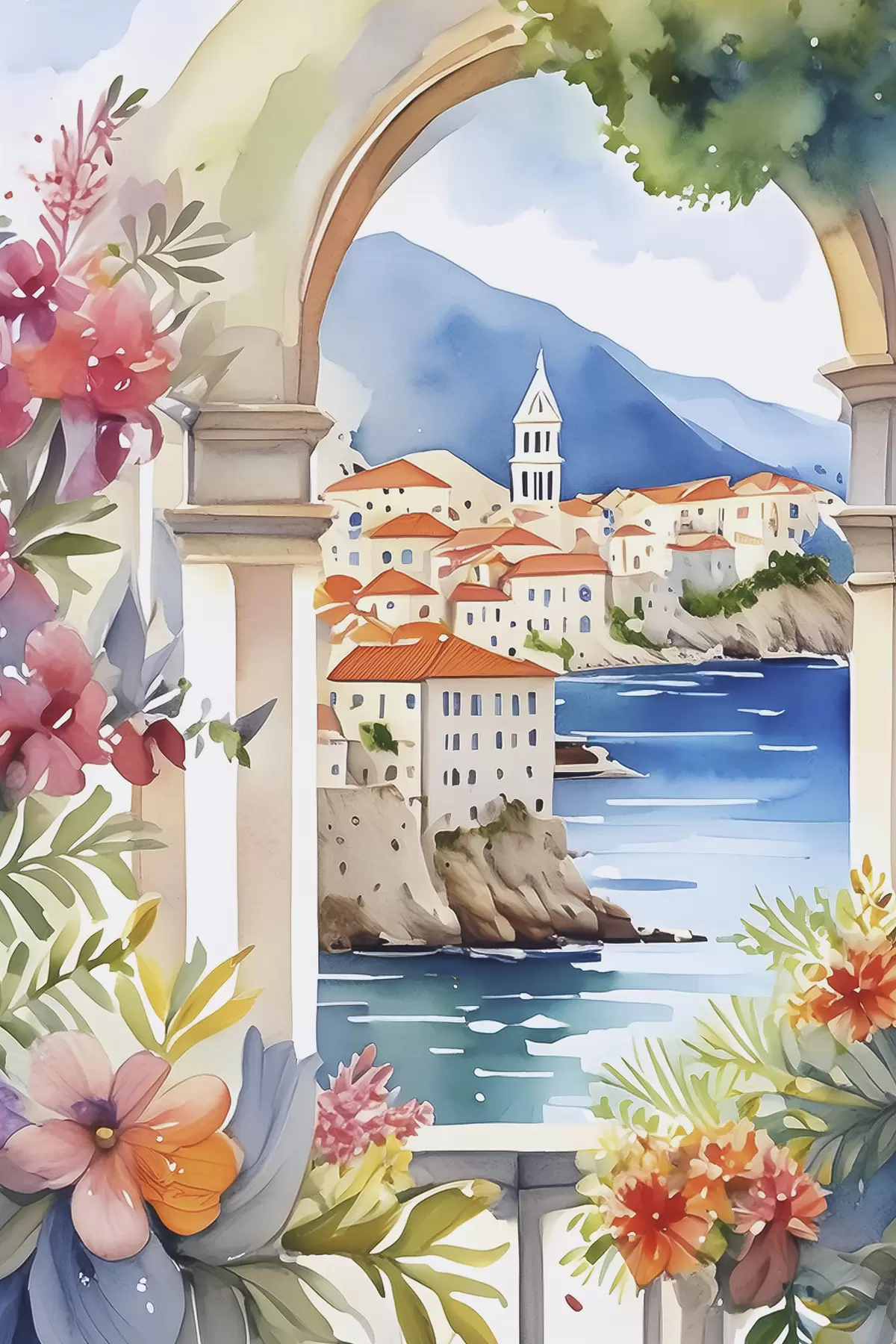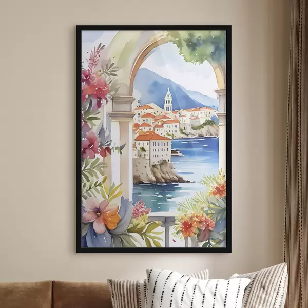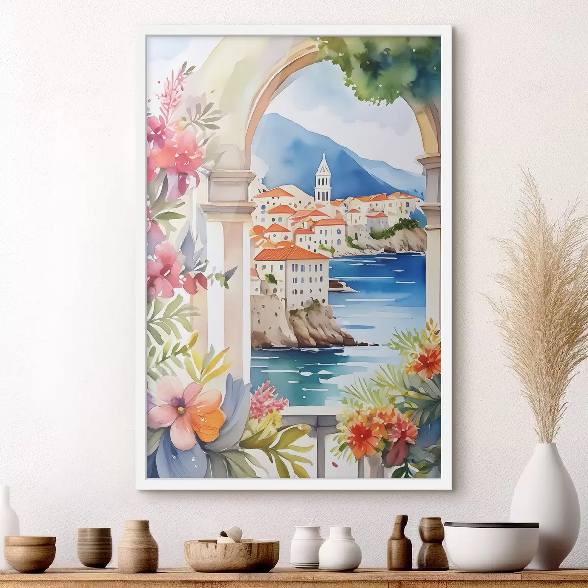 Affiche Architecture méditerranéenne, aquarelle, fleurs d'été, mer bleue, montagnes f38408