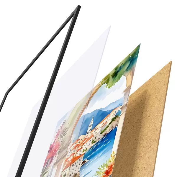 Le poster se compose d'un cadre, d'un plexiglas, d'une image imprimée et d'un support en aggloméré. Le poster peut être immédiatement accroché au mur grâce aux fixations au dos.