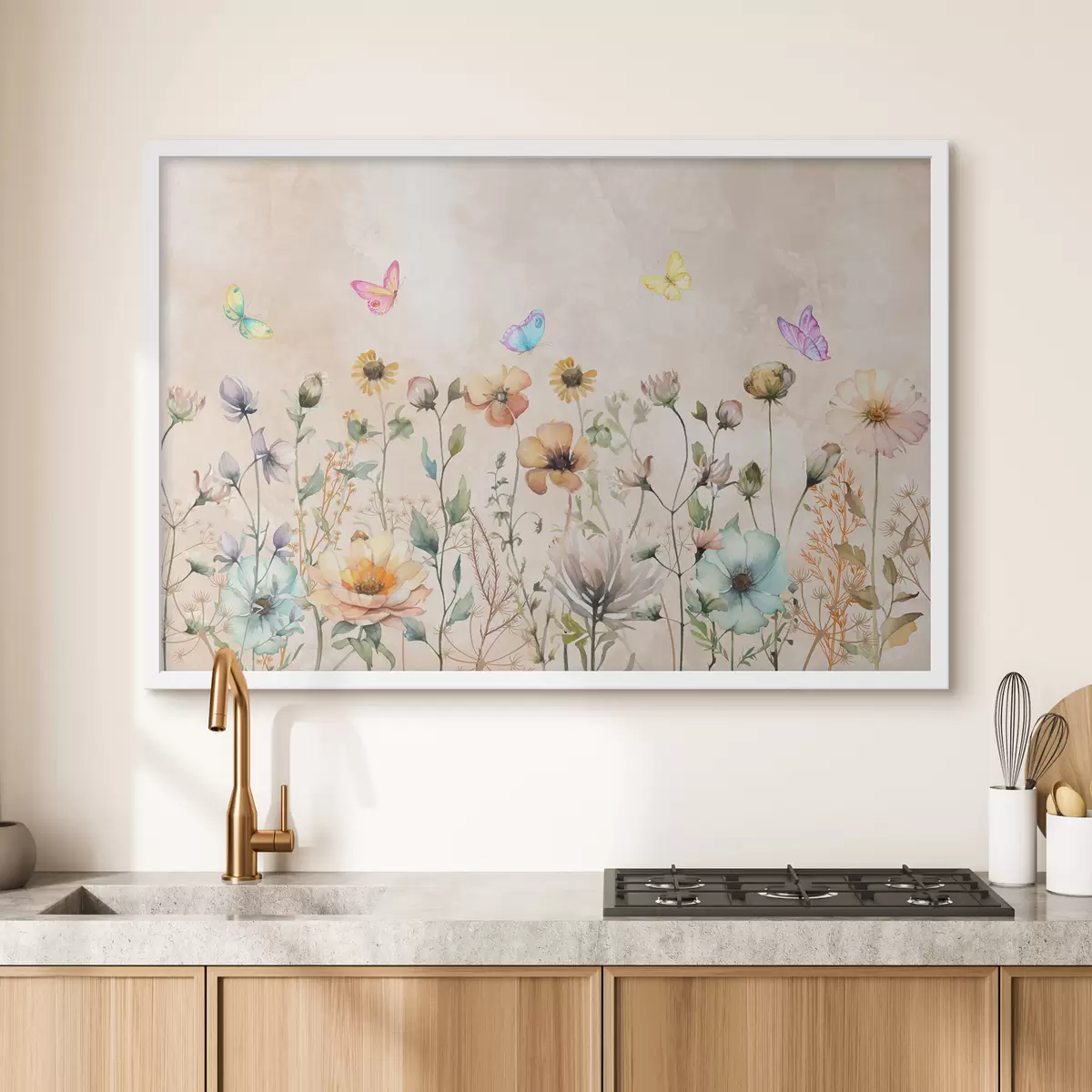 Affiche fleurs sauvages avec aquarelles, papillons lumineux, pastels f38441