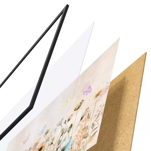 Le poster se compose d'un cadre, d'un plexiglas, d'une image imprimée et d'un support en aggloméré. Le poster peut être immédiatement accroché au mur grâce aux fixations au dos.