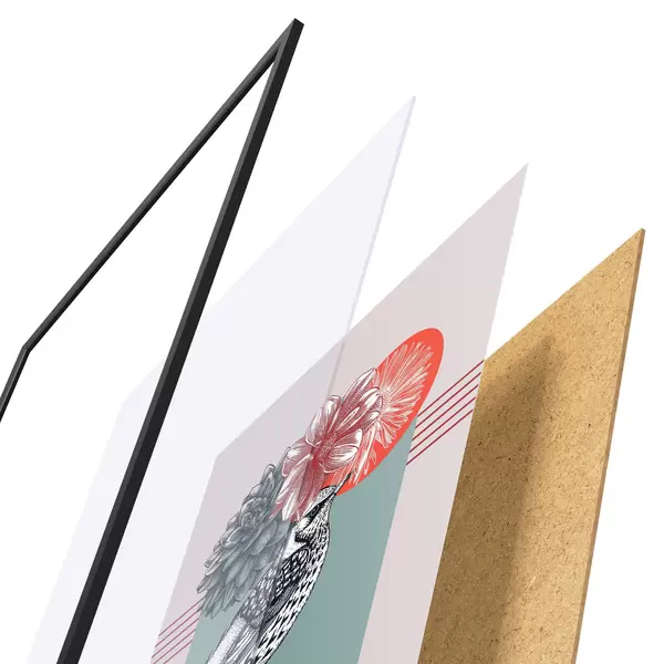 Le poster se compose d'un cadre, d'un plexiglas, d'une image imprimée et d'un support en aggloméré. Le poster peut être immédiatement accroché au mur grâce aux fixations au dos.