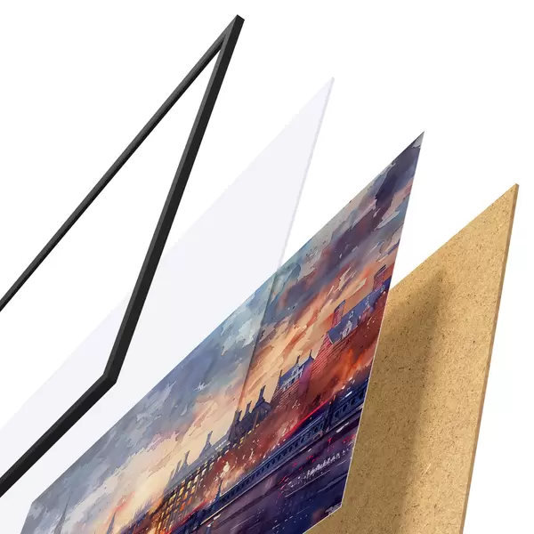 Le poster se compose d'un cadre, d'un plexiglas, d'une image imprimée et d'un support en aggloméré. Le poster peut être immédiatement accroché au mur grâce aux fixations au dos.