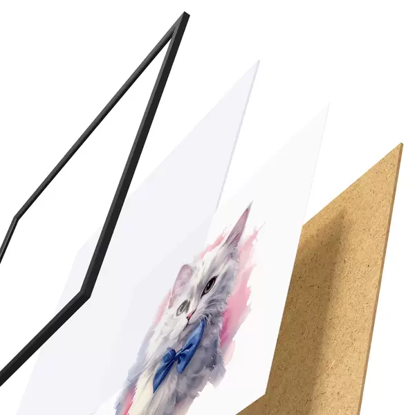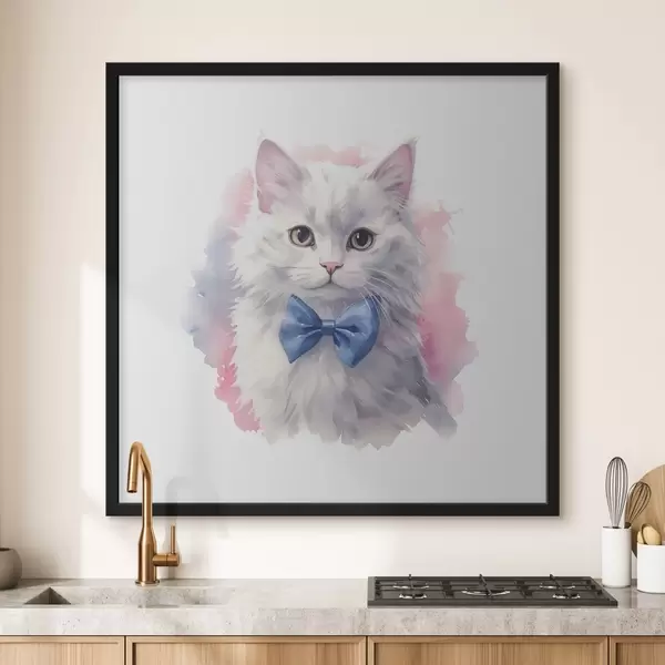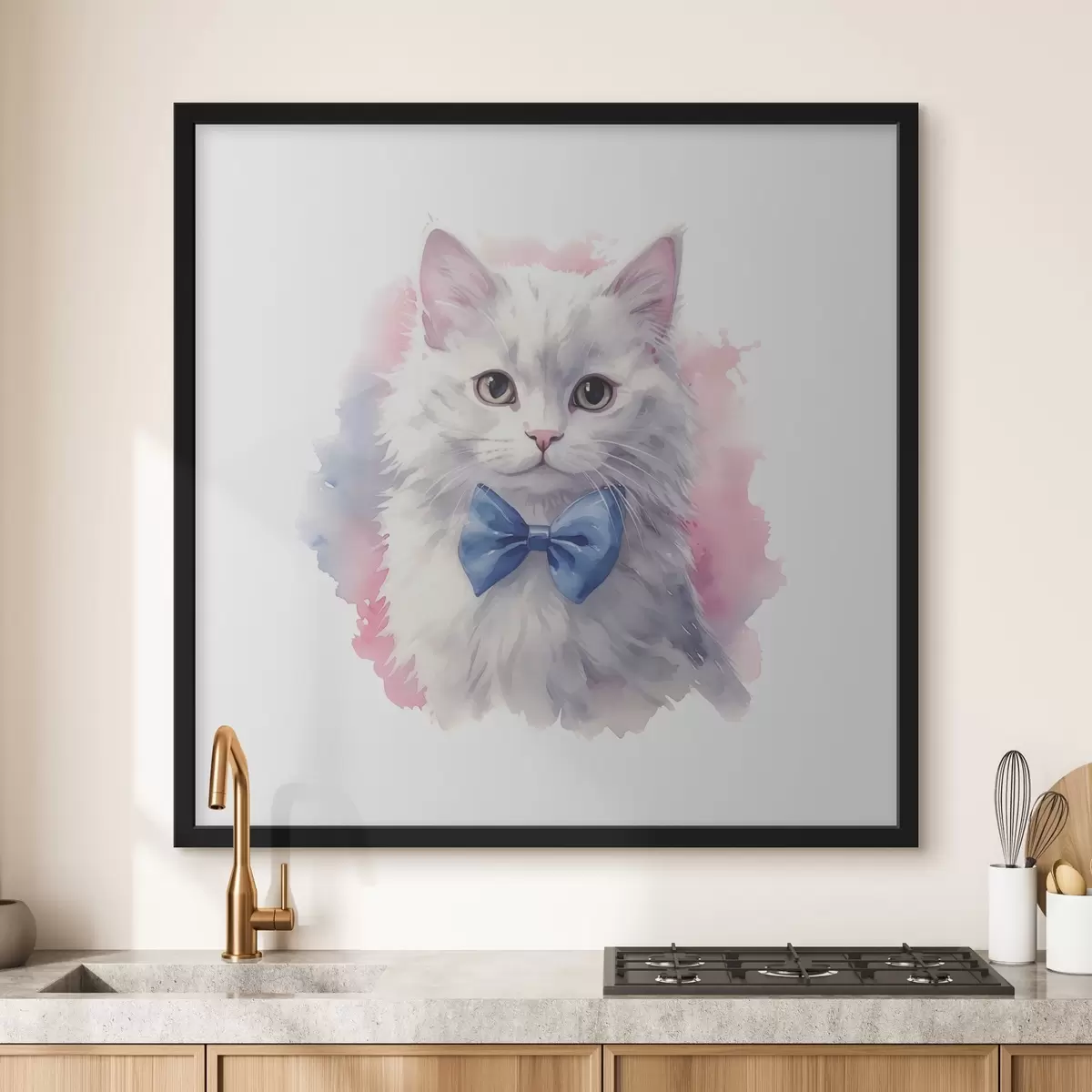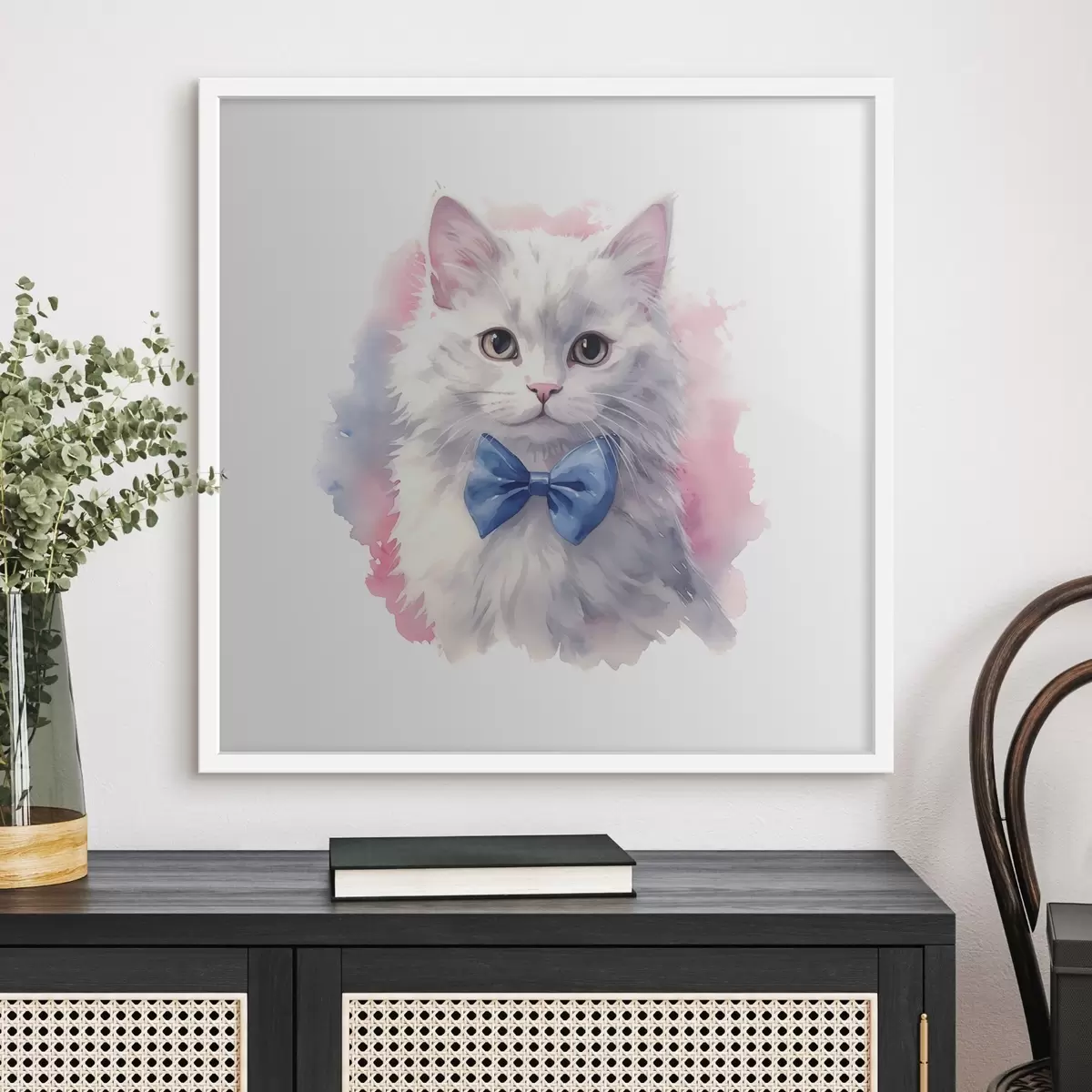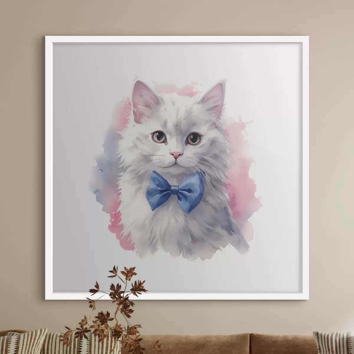Affiche Chat blanc en peluche avec un noeud bleu sur le cou, aquarelle, animal, gris, blanc, rose, couleur bleue Non f38479