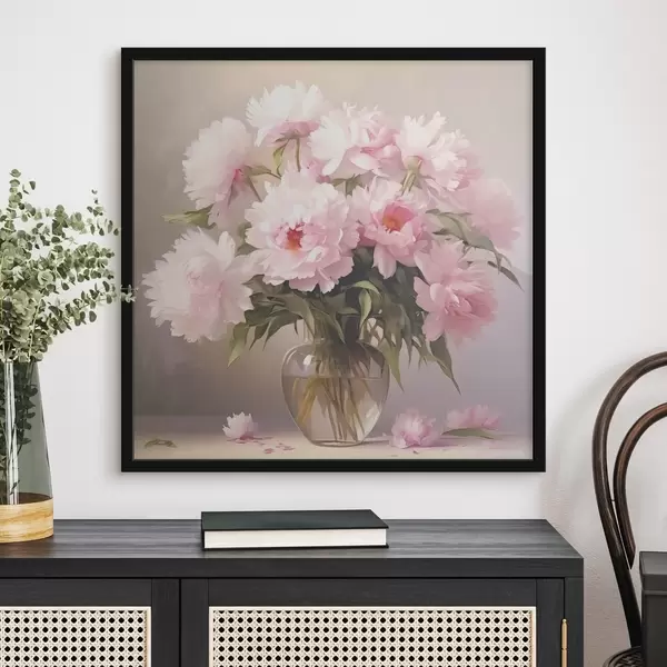 Affiche Pivoines roses dans un vase en verre sur fond noir, imitation d'une peinture à l'huile, fleurs f38482