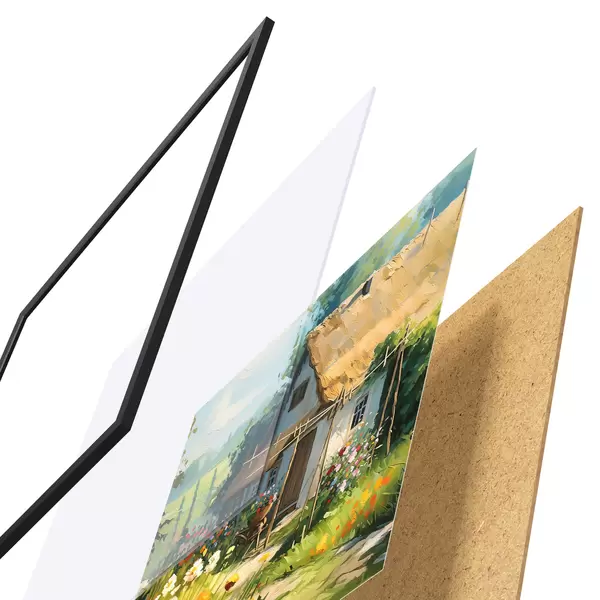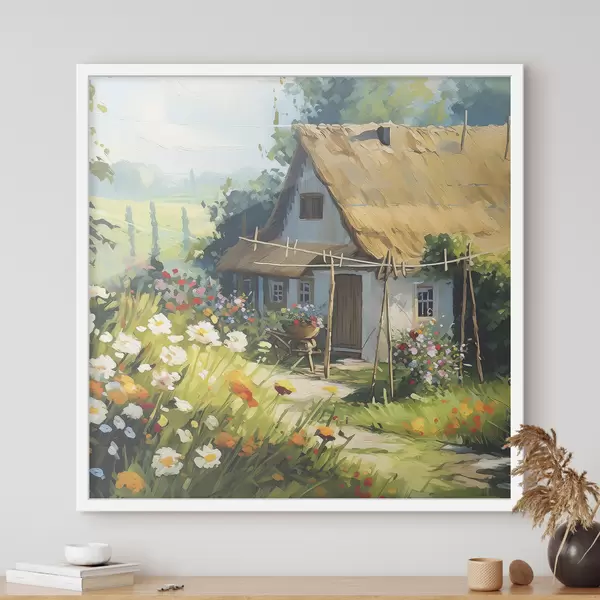 Affiche Maison de village avec jardin, fleurs d'été, peinture à l'huile, coups de pinceau, champ, style rustique Non f38491