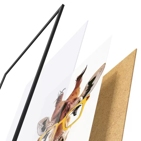 Le poster se compose d'un cadre, d'un plexiglas, d'une image imprimée et d'un support en aggloméré. Le poster peut être immédiatement accroché au mur grâce aux fixations au dos.