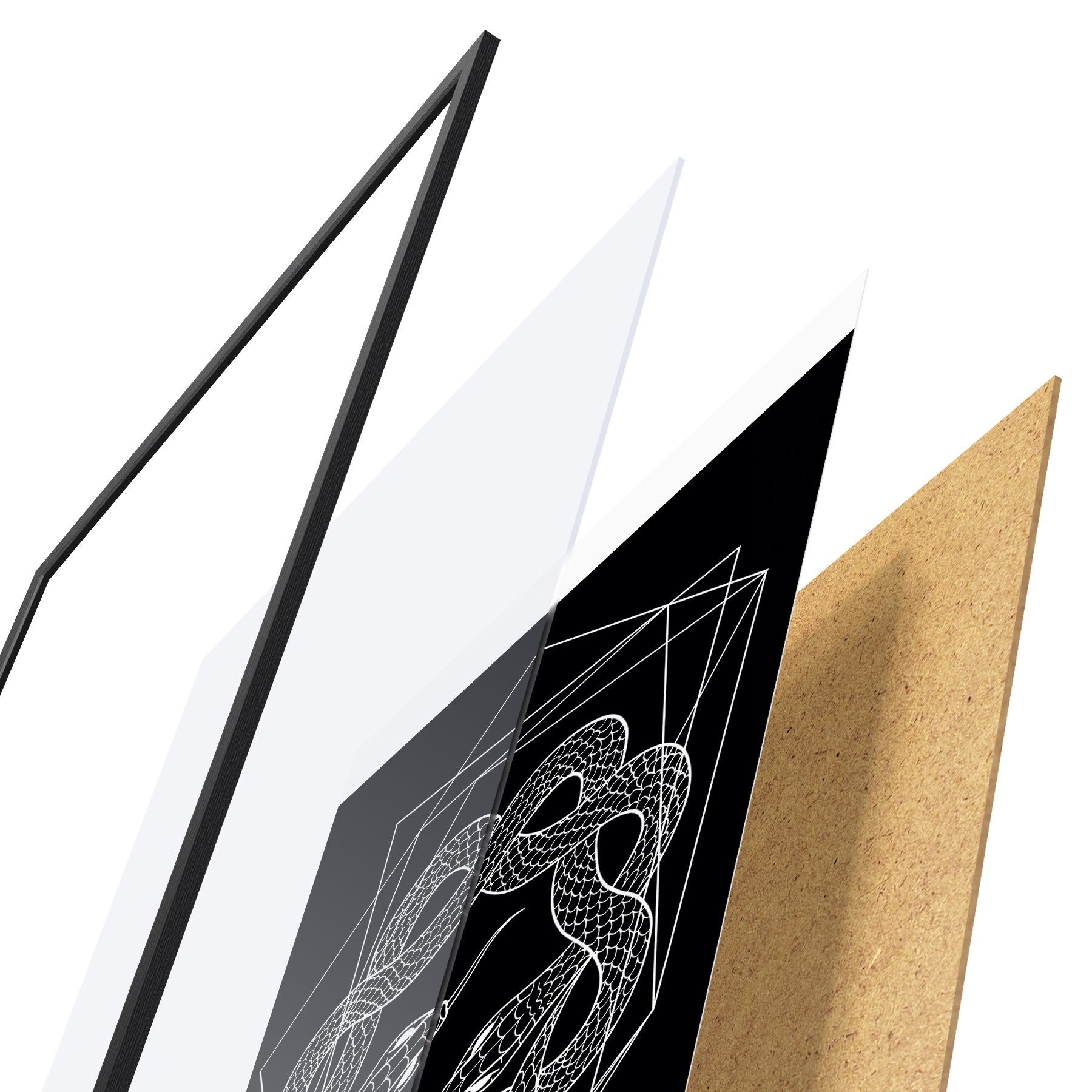 Le poster se compose d'un cadre, d'un plexiglas, d'une image imprimée et d'un support en aggloméré. Le poster peut être immédiatement accroché au mur grâce aux fixations au dos.